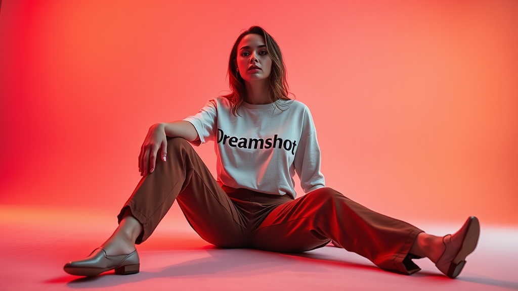Wide and low angle cinematic fashion photography for Dreamshot brand featuring a woman seated on the floor wearing a Dreamshot heattech top prominently displaying the "Dreamshot" logo in large letters. She pairs it with stylish brown chinos. The studio background transitions in a smooth gradient of fiery red, soft pink, and vibrant orange tones. The woman exudes confidence and elegance, with the composition highlighting both the outfit and the dynamic, colorful setting, creating a dreamy, aspirational atmosphere.