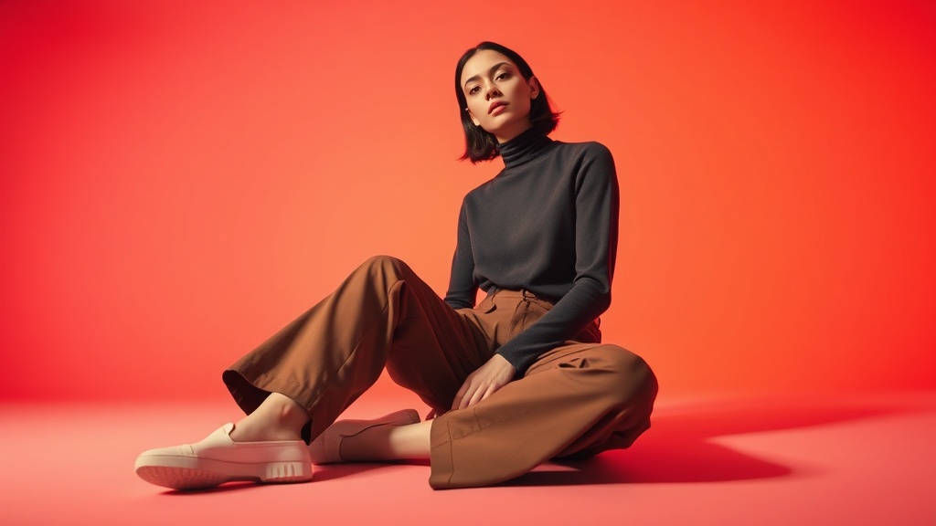 View this AI-generated image featuring wide and low angle cinematic fashion photograph for uniqlo featuring a woman sitting confidently on the floor dressed in a uniqlo heattech long sleeve top paired with stylish tailored brown chinos the studio backdrop transitions in a smooth gradient of warm hue