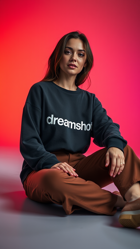 Wide angle cinematic fashion photo for Dreamshot brand showing woman seated on floor wearing Dreamshot heattech top prominently featuring "Dreamshot" logo in bold text, paired with stylish brown chinos, vibrant gradient backdrop blending red, pink, and orange in a studio setting, the top slightly oversized for a relaxed yet fashionable look, her pose elegantly casual, evoking confidence and modernity, soft lighting enhancing the warm tones, creating an inviting and aspirational feel.