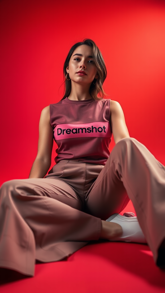 Wide-angle, cinematic fashion photograph featuring a woman sitting comfortably on the floor, wearing a sleek Dreamshot heattech top prominently displaying the "Dreamshot" logo. She pairs it with stylish taupe chinos. The studio background is a vibrant gradient blending shades of red, coral pink, and tangerine, enhancing the overall dynamic mood. Soft lighting casts subtle shadows, highlighting the modern and elegant aesthetic, while the low-angle perspective emphasizes the sophisticated yet relaxed vibe of the Dreamshot brand.