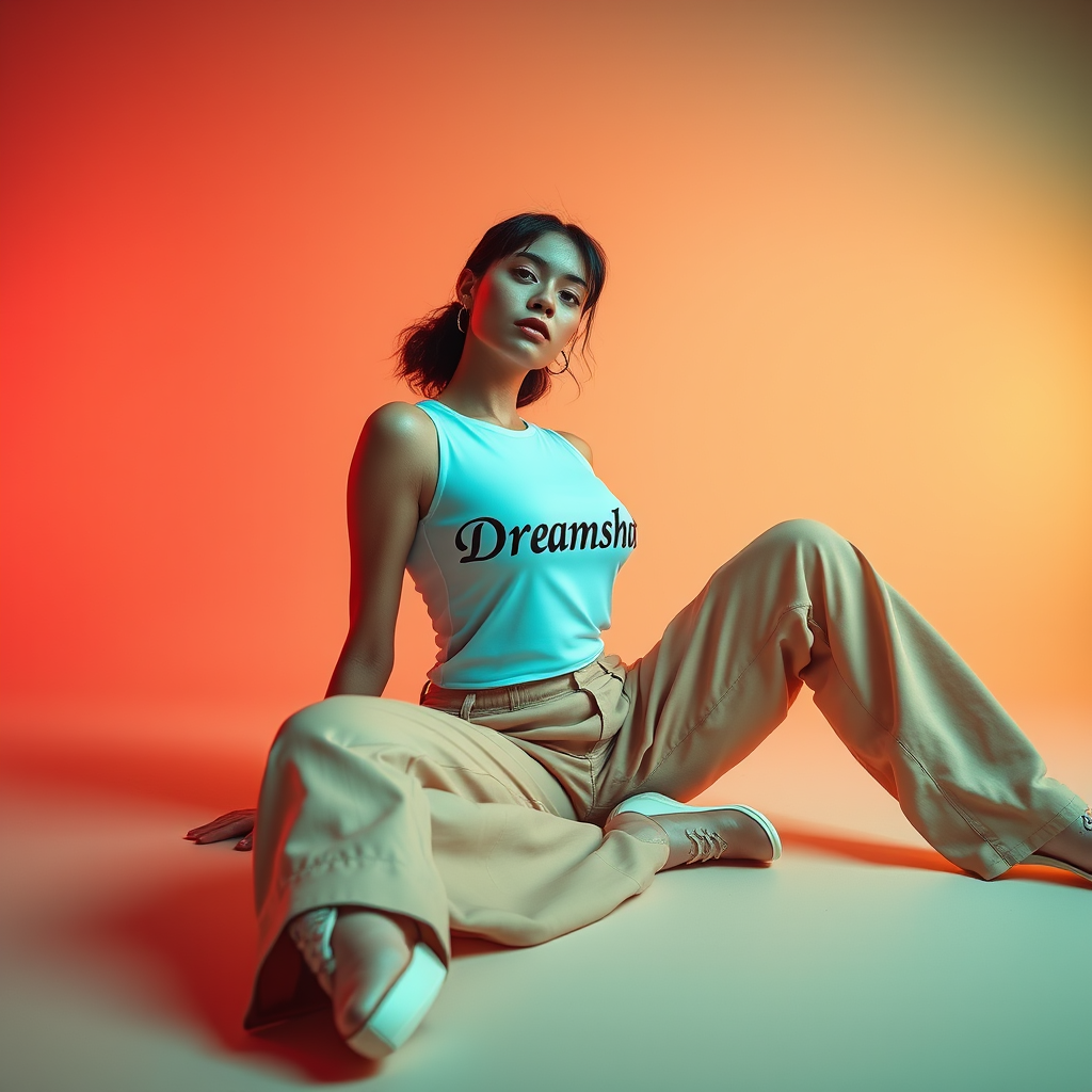 Wide-angle cinematic fashion photography for Dreamshot brand. A woman is elegantly posed on the floor, sporting a sleek Dreamshot heattech top with an eye-catching \"Dreamshot\" logo prominently displayed. She pairs it with stylish beige chinos. The background is an artistic gradient blending warm tones of coral, peach, and tangerine, creating a vibrant studio setting. Her pose exudes confidence and modernity, capturing the essence of the Dreamshot brand in a captivating visual story.