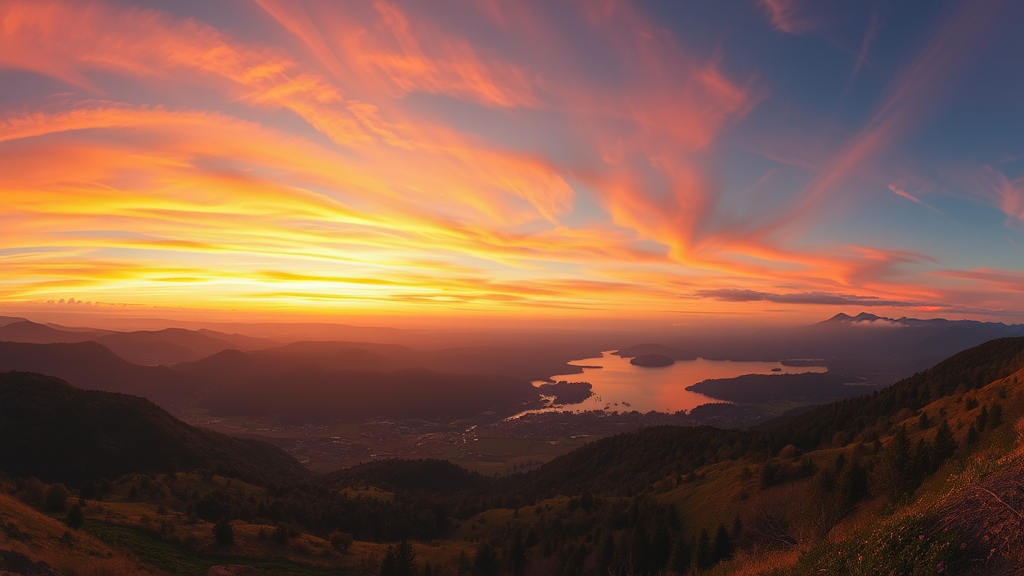 Wide-angle cinematic landscape, vibrant sunset hues, rolling hills, serene lake reflections, distant mountain silhouettes, lush green valley, wisps of soft clouds, gentle breeze swaying trees, golden hour glow, tranquil atmosphere, nature's harmony, secluded escape, immersive panoramic view, breathtaking serenity, ethereal beauty.