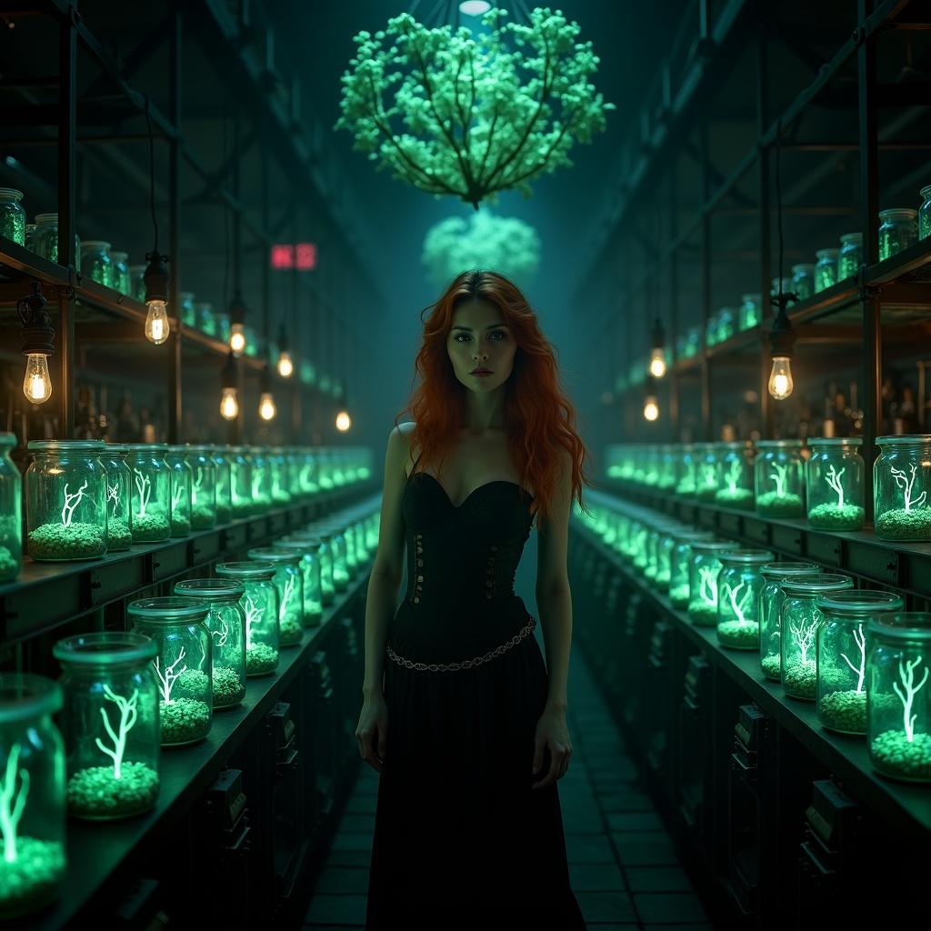 View this AI-generated image featuring wide angle raw photo of a striking woman with auburn hair surrounded by thousands of glowing magical plants in jars set in a dimly lit victorian laboratory steampunk aesthetic influences the setting with elements reminiscent of edgar allan poe and h p lovecraft