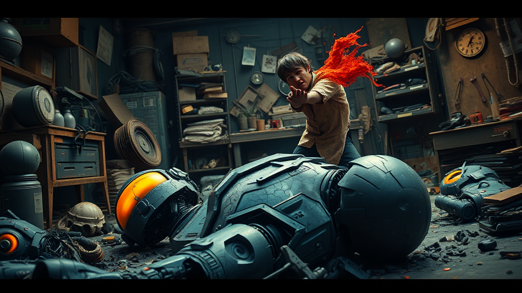 Wide angle environmental scene in a cluttered and chaotic workshop, showcasing an action shot of a figure in a tattered, torn shirt with skin resembling cracked porcelain, heavily inspired by League of Legends. The atmosphere is vibrant yet dramatic, combining photorealistic and hyper-realistic elements in a dark setting. In sharp focus 8k resolution, a robot lies destroyed, pieces scattered, featuring a glowing yellow visor reminiscent of a sci-fi cyberpunk knight. This medium shot captures intricate details, rendered with Unreal Engine, and employs cozy indoor lighting. Influences include the artistic styles of James Gurney, Katsuhiro Otomo, James Paick, with cinematic lighting, and vibrant nature touches. The visual language echoes the works of Craig Mullins, Greg Rutkowski, Pete Morbacher, and Tuomas Korpi, capturing the essence of Tekkon Kinkreet. The scene is enriched with volumetric lighting and features rendering techniques trending on ArtStation, ensuring sharp focus, studio photo quality, and highly detailed composition, channeling the intricate artistry of Greg Rutkowski while steering clear of clichés seen in bad prompts or generic anime styles.