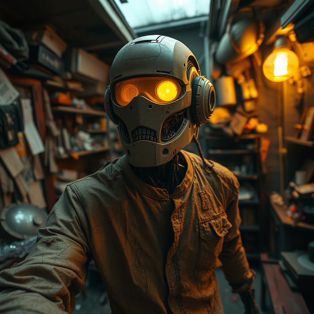 Wide angle environmental shot in a disorganized and chaotic shack, action shot, worn-out tattered shirt, porcelain cracked skin, inspired by League of Legends, vibrant and photorealistic, dramatic, dark, sharp focus, 8k resolution. A robot shattered into pieces with a glowing yellow visor, resembling a realistic sci-fi cyberpunk knight, medium shot, intricate details, rendered in Unreal Engine, cozy indoor lighting. Artstation style with cinematic lighting, vibrant natural elements, influences from artists like James Gurney, Katsuhiro Otomo, James Paick, and Craig Mullins. Incorporates the artistry of Greg Rutkowski, Pete Morbacher, and Tuomas Korpi. Reflects themes from Tekkon Kinkreet, volumetric lighting, trending on Artstation, using octane rendering. Sharp focus, studio-quality photo, highly detailed by Greg Rutkowski.