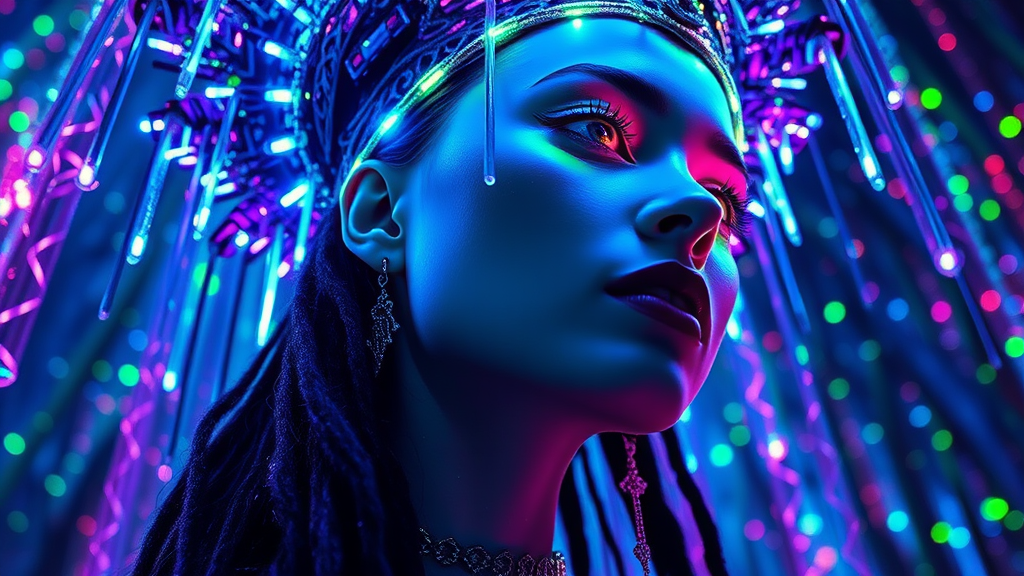 Wide-angle fashion photography capturing the upper body of an enigmatic woman, her gaze fixed dreamily into the distance. Her skin glows with an intense bioluminescent cybercore allure, surrounded by an insanely detailed and intricate marginalia headdress. She is a vision of beauty, dripping in a cascade of bright neon lights, a dazzling array of colors—blue, green, and purple—pulsating with life. The scene is set in a glowing forest, a vivid neon wonderland brimming with dreamlike particles in shades of blue, green, and purple. The composition follows the rule of thirds and golden ratio, incorporating photorealism and raytraced shadows for depth. Asymmetric and hypermaximalist design enhance the insane details, utilizing octane render and cinematic realism techniques, akin to an 8k Unreal Engine masterpiece.