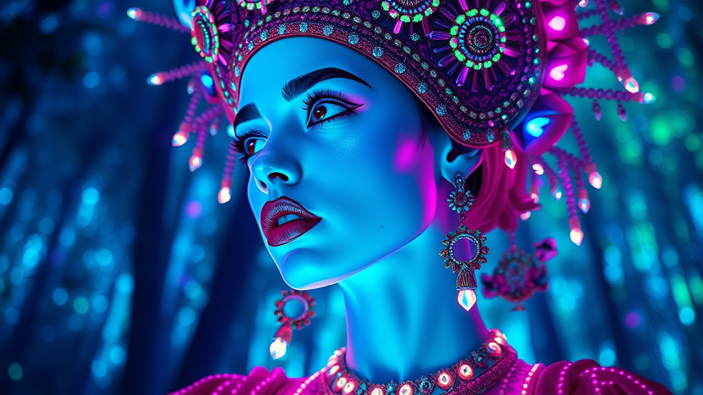 Wide-angle fashion photography capturing the upper body of a woman with a surreal, dream-like essence, her gaze fixed into the distance. The setting showcases a bioluminescent cybercore aesthetic with intense glowing skin. She's adorned with an intricately detailed, elaborate headdress, reminiscent of rich marginalia, complemented by vibrant neon hues—gorgeous shades of blue, green, and purple that drip with bright neon lights. The background unfolds as a glowing forest, a vivid neon wonderland filled with ethereal particles in blue, green, and purple, creating a fantastical dreamscape. Visual parameters include adherence to the rule of thirds and the golden ratio, coupled with photorealism. Emphasis is placed on raytraced shadows, a dynamic depth of field, and an asymmetric composition, styled in a hypermaximalist fashion with insane attention to detail, rendered using octane for cinematic and unreal engine realism in stunning 8k resolution.