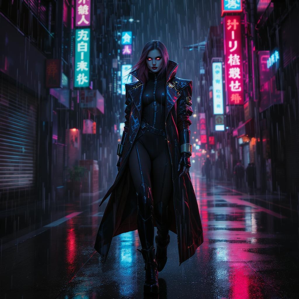 Wide-angle full-length picture of a woman in futuristic sci-fi fashion, wearing realistic footwear. The scene is set in a rain-drenched neotokyo, with a dramatic bladerunner-inspired atmosphere. She dons a stylish movie jacket coat, blending cyberpunk and synthwave aesthetics, illuminated by low-emission neon lights. Her eyes are symmetrical, and the image is captured in ultra high-resolution, photorealistic 8k, with hyperrealism and dramatic lighting. The setting feels like a bladerunner movie scene, rendered in high quality with octane and 3d modeling. The atmosphere is immersive and vivid, avoiding lowres and jpeg artifacts, capturing the essence of a futuristic cityscape.