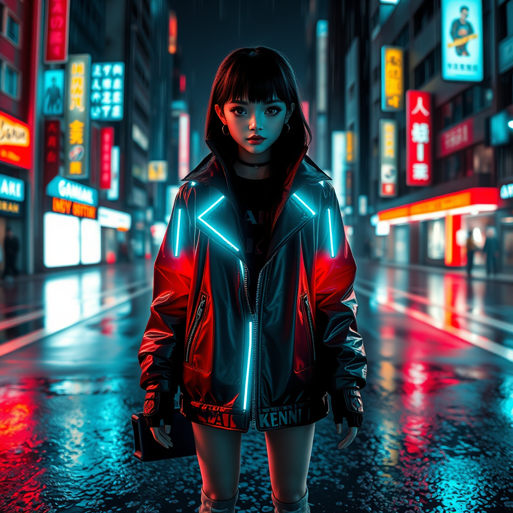 Wide-angle full-length picture, realistic footwear, one girl standing in the rain, futuristic sci-fi fashion highlighted by a sleek, neon-lit jacket coat. Set against the backdrop of a cyberpunk city, reminiscent of Neo Tokyo with synthwave aesthetics. The scene evokes the atmosphere of a Blade Runner movie, enhanced by low-emission neon lights that reflect dramatically in the rain-soaked streets. Her eyes are symmetrical, with an ultra high-res and hyperrealistic render in 8k resolution. The photograph employs dramatic lighting and is crafted with CGI for photorealistic detail. The character presents a doll-like appearance with meticulous attention to facial features, captured using advanced rendering techniques. Avoid flaws such as poor anatomy, bad proportions, and any deformities; focus on a perfect, futuristic portrayal without any visual interruptions or distractions.