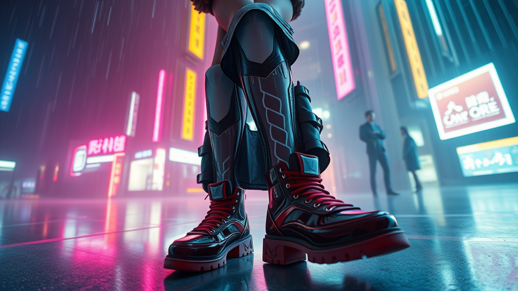 Wide angle full-length picture realistic footwear futuristic sci-fi fashion cyberpunk neotokyo synthwave aesthetics low-emission-neon bladerunner movie scene dramatic lighting photography cgi doll octane render 1girl Storm Rain futuristic movie jacket coat photorealistic 8k hyperrealism ultra highres symmetrical eyes.