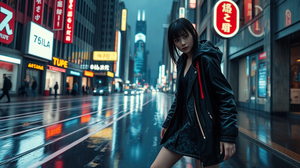 Wide angle full-length picture realistic footwear 1girl Storm Rain movie Jacket coat Futuristic sci-fi fashion cyberpunk neotokyo synthwave aesthetics futuristic low-emission-neon bladerunner movie scene symmetrical eyes ultra highres photorealistic 8k hyperrealism dramatic lighting photography cgi 3d doll octane render detailed textures intricate patterns neon reflections atmospheric perspective sleek design rain-soaked streets illuminated signage dynamic pose city skyline in background high-tech urban vibe sleek hairstyle confident expression dramatic shadows cinematic ambiance rain droplets mid-air enhanced details realistic skin texture moody lighting balanced composition futuristic architecture in frame.