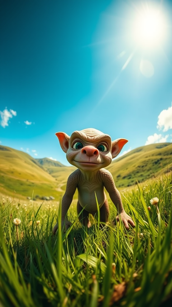 Wide-angle lens captures an expressive portrait of a goblin-like creature in a lush meadow, rolling green hills in the background under a radiant blue sky, sunlight enhancing the vivid hues of the scenery.