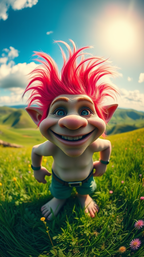 Wide-angle lens capturing a vibrant portrait of a mischievous troll with a playful expression, standing in a lush, green meadow, surrounded by rolling hills, basking under a bright, sunny sky with vivid, cheerful colors.