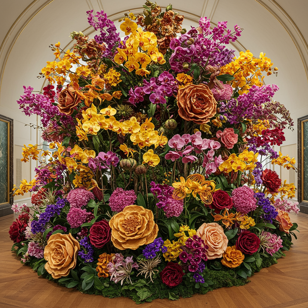 Wide angle photograph capturing a grand and lush arrangement of orchids and wild blossoms, exquisitely displayed; the flowers exude an Art Nouveau essence. This vibrant and captivating display features a palette of rich golds, ochre yellows, deep crimson reds, velvety violets, and soft muted pinks. These artistic flowers, meticulously crafted from delicately crumpled paper and smooth silk, create a striking contrast of textures. The scene is captured in 8k high resolution, showcasing the intricate beauty and elegance of each bloom, all set against an aspect ratio of 2:3 with an elevated sense of style and sophistication.