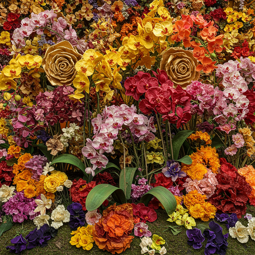 wide angle photograph of an expansive, lavish arrangement of orchids and wild blossoms showcased as a stunning piece of art nouveau; the flowers exude vibrancy and beauty, predominantly in shades of shimmering golds, rich ochre yellows, deep crimson reds, regal violets, and soft muted pinks; crafted meticulously from crumpled paper and silk, each blossom exudes an intricate texture; photographed in 8k high resolution, capturing every delicate detail, the scene is a harmonious blend of nature and art with a touch of creative whimsy