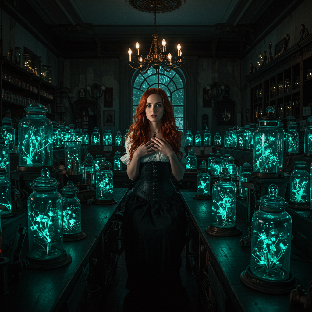 Wide-angle RAW photo of a stunning woman with auburn hair amidst thousands of bioluminescent magical plants encased in jars, inside a dimly lit Victorian laboratory. Steampunk aesthetics blend with echoes of Edgar Allan Poe and H.P. Lovecraft, captured in hyperrealism with intricate detail and forced perspective. The scene is vivid and immersive, evoking a sense of mystery and enchantment. The room is filled with the soft glow of the jars, casting intricate shadows and creating a magical atmosphere that accentuates the woman's striking features.
