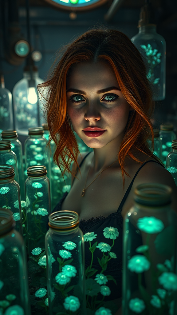 Wide-angle RAW photo of an attractive woman with auburn hair surrounded by thousands of magical bioluminescent plants in jars, set in a dimly lit Victorian laboratory. The scene is inspired by steampunk, Edgar Allan Poe, and HP Lovecraft, rendered in hyperrealistic and highly detailed style employing forced perspective. Avoid elements like Photoshop, video game aesthetics, tiling, or poorly drawn features. Ensure consistent anatomy, clear focus, and vibrant colors throughout, emphasizing an immersive experience without disfigurement or unrealistic mutations. Ratio 16:9, envisioned through version 5.