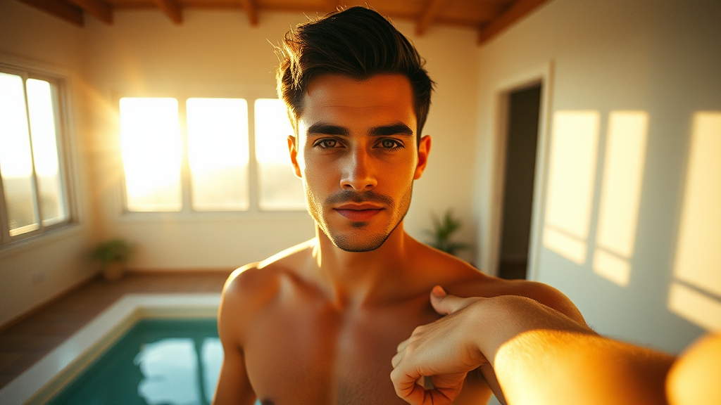 Wide angle shot, hyper-detailed photograph, attractive man in stylish swimwear, enhanced lighting effects, impeccable focus, captured on iPhone 14 using mirror reflection, neatly cropped dark hair, sunlit airy room, subtle film grain texture, Kodak Portra 800 vibe, aperture setting f1.8, basking in the warm glow of golden hour.