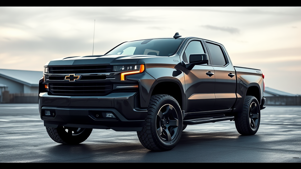 Wide-angle shot of a futuristic Chevy Silverado pickup truck with a sleek and aerodynamic front end, featuring concealed headlights that blend seamlessly into the design. The truck sports five windows and exudes a cyberpunk aesthetic reminiscent of Cyberpunk 2077, with perfect tires that add to its futuristic appeal. The bold and edgy design elements merge to create a concept vehicle that embodies innovation and power, setting a new standard for the future of trucks.