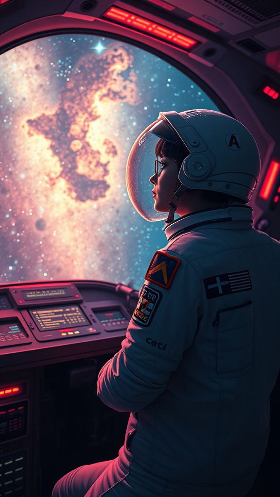 Wide angle shot of a uniformed astronaut girl inside a spaceship command room, gazing at the galaxy. The scene is infused with sci-fi neon lights, creating a fantasy atmosphere that is intricate, beautiful, and elegant. The artwork is highly detailed, evoking styles reminiscent of Tian Zi, WLOP, and Alphonse Mucha. It captures the smooth and sharp focus in a digital painting style typical of concept art found on ArtStation. The design showcases a harmonious and mesmerizing environment, focusing solely on the lone astronaut and her interaction with the vast universe outside.