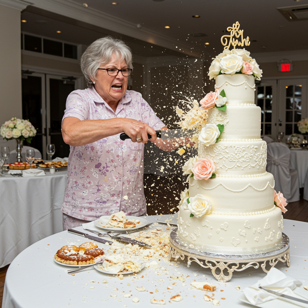 Wide-angle view captures the intense moment as a bespectacled grandmother in her pajamas furiously slashes into an ornate, multi-tiered wedding cake with a large knife. The scene is bathed in white light, highlighting her tight grip and determined, angry expression. Suddenly, the cake bursts into a frenzy of crumbs and chaotic pieces, embodying the grandmother's frustration. In the background, the wedding catering is elegantly set in pure white tones.