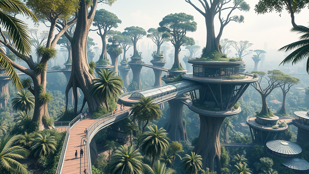Wide angle view of a futuristic forest city featuring interconnected glass bridges linking sustainable architecture structures embedded within colossal trees, surrounded by a lush tropical biome, inspired by redshift render techniques reminiscent of Syd Mead; medium angle captures of a futuristic treehouse metropolis showcasing brutalist buildings integrated into the natural flora, with people engaging as they sit, stand, and walk around the complex, encapsulating a conceptual watercolor style influenced by John Harris; a hyperrealistic cityscape of the future bursting with color, intricate detailing, and bold contrast lighting.
