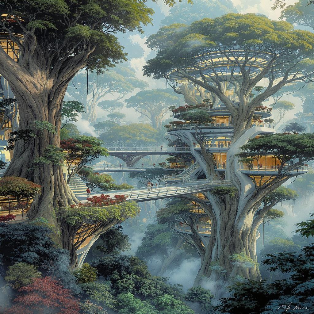 Wide angle view of a futuristic forest city featuring interconnected glass walkways weaving through sustainable architecture structures, seamlessly integrating with immense trees in a lush tropical biome. Rendered in redshift with Syd Mead's visionary style, this urban landscape transitions to a closer perspective, highlighting a medium angle shot of a futuristic treehouse metropolis. Brutalist architecture blends with the natural flora, alive with people sitting, standing, and walking around the complex. This conceptual scene is rendered in the dreamy watercolor style of John Harris. Envision a city of the future with hyperrealistic detail, vibrant colors, and bold contrasting lighting, capturing the intricate artistry and harmonious coexistence of nature and urbanity in a 16:9 aspect ratio.