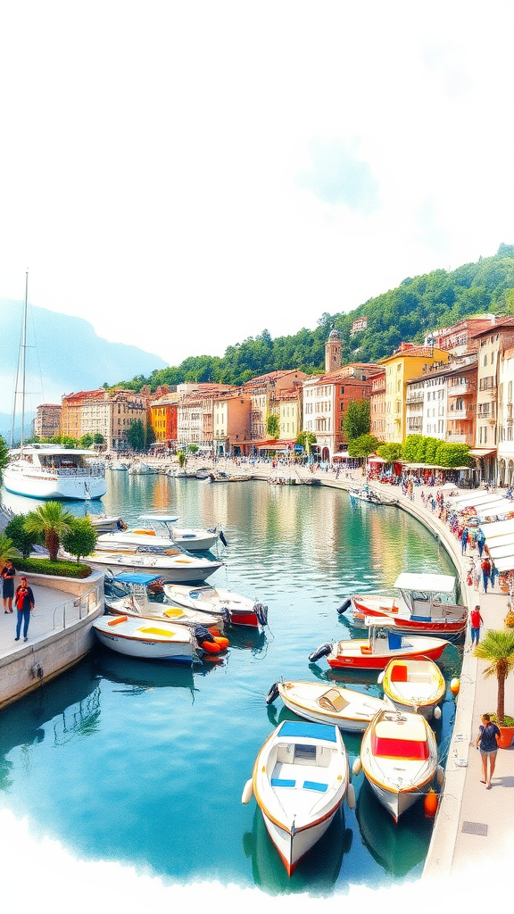 Wide angle view of Riva del Garda, a picturesque Mediterranean Italian harbor with watercolor effects, capturing a dreamy atmosphere through bright colors and intricate details. The scene is reminiscent of a master artist's touch, with a focus on soft lighting that bathes the harbor. The composition embraces a quaint charm, where the people blend seamlessly into the scene, their forms slightly abstract and stylized. The overall impression is one of serene beauty, subtly textured as if on damp paper, with a whimsical yet harmonious blend of artistry and imperfection.