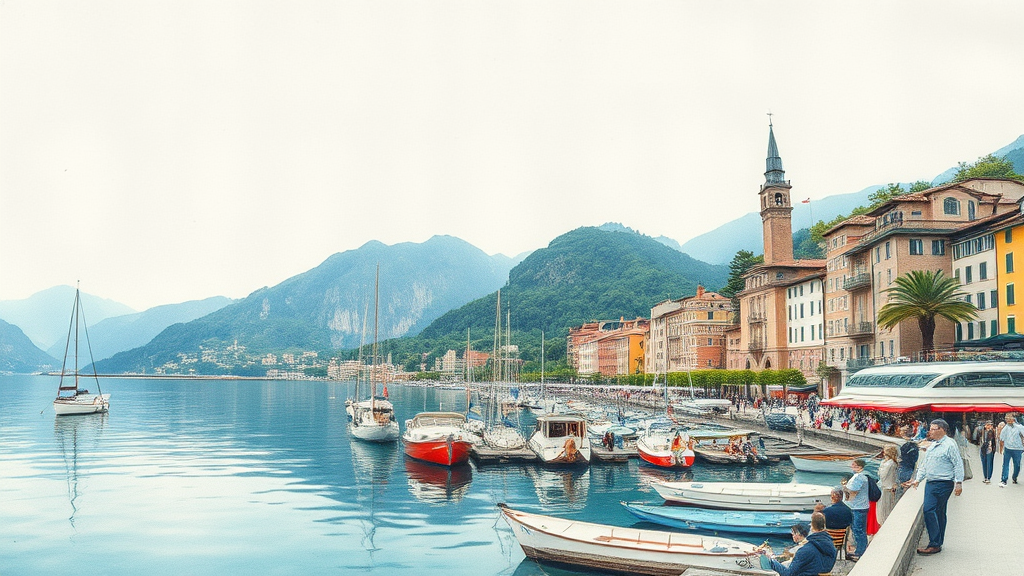 Wide angle view of Riva del Garda, Mediterranean Italian harbor scene, damp paper texture, watercolor ambiance, whimsical, vibrant colors, elaborate detail, gentle lighting, masterful simplicity, low resolution, intentionally coarse, crowd, exaggerated anatomy.