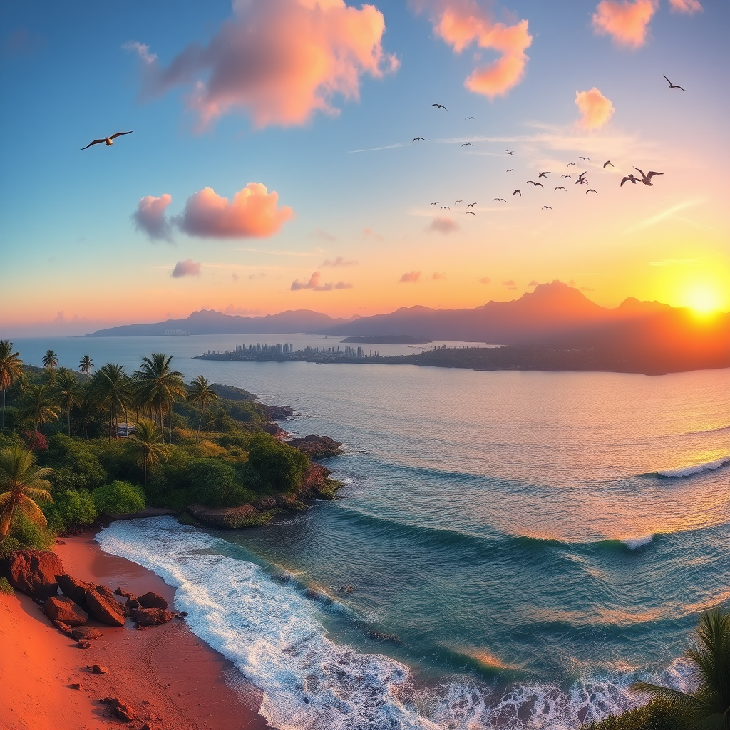 Wide panoramic vista of a serene landscape, vibrant colors reflecting a setting sun, gentle waves lapping against a sandy shore, tall silhouettes of palm trees swaying in the tropical breeze, distant mountains casting shadows over lush greenery, a sense of tranquility permeates the scene, wildlife subtly integrated amidst the flora, a flock of birds soaring high in the open sky, the horizon stretching infinitely, whispers of adventure and exploration in the air.