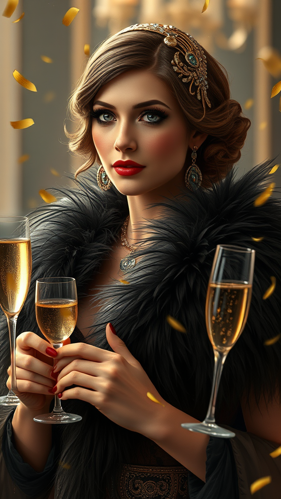 Wide shot character portrait capturing an elegant socialite, a stunning woman in 1920s Gatsby party fashion, adorned in a luxurious art nouveau ermine stole, exuding classiness, feathers elegantly complementing her ensemble, surrounded by champagne flutes and golden confetti, exhibiting high detail in a cinematic composition, concept painting, resembling ArtStation’s painterly style, created with digital speed painting techniques, set in a widescreen format, capturing the spirit of a bygone era while trending in modern art circles.