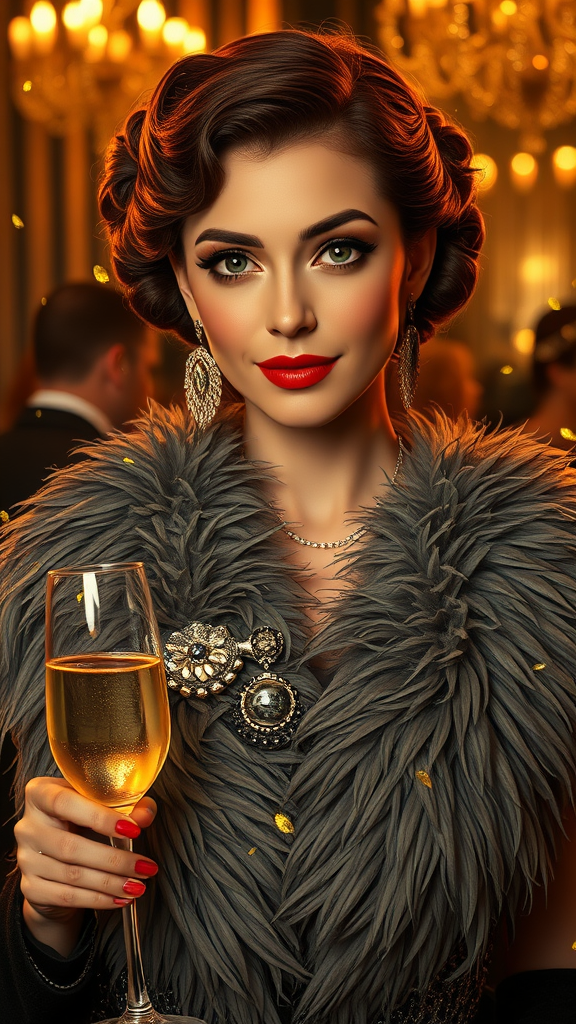 Wide shot character portrait, elegant socialite, beautiful woman, 1920s Gatsby party, art nouveau ermine stole, sophisticated, opulent feathers, champagne and golden confetti, intricately detailed, cinematic composition, concept painting, ArtStation-inspired painterly concept, high detail, digital speed painting, widescreen, popular on ArtStation, 3:2 aspect ratio.