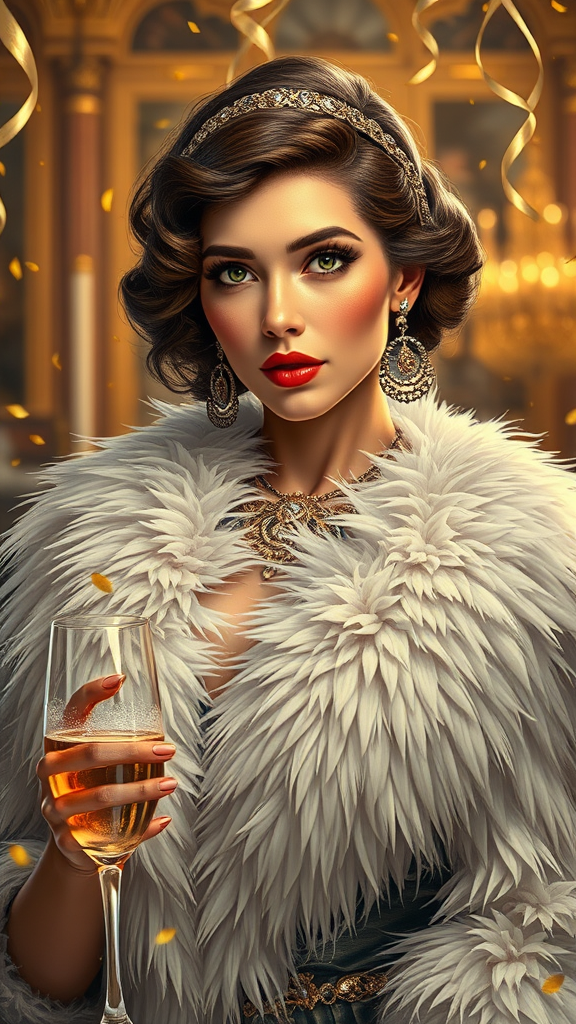 Wide shot character portrait of an elegant, beautiful socialite in 1920s Gatsby party style, featuring an art nouveau ermine stole, exuding class and sophistication, adorned with feathers, amidst a scene of champagne and gold confetti, highly detailed with a cinematic composition. This concept painting captures a high-detail digital speed painting aesthetic, reminiscent of an ArtStation painterly concept, set in widescreen format, visually compelling and trending on modern art platforms.