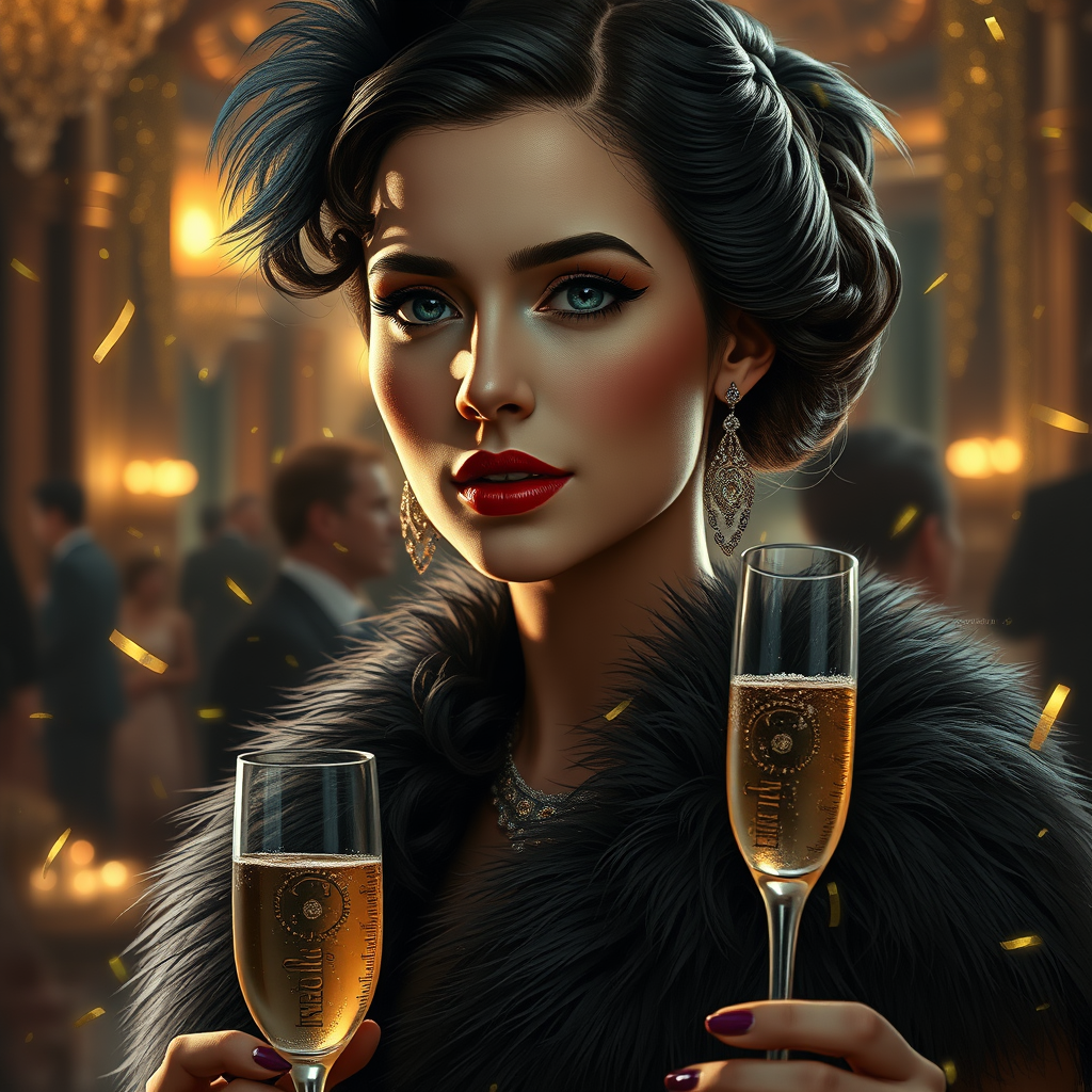 Wide shot character portrait of an elegant debutante, captivating woman, 1920s Gatsby soirée, art deco mink stole, refined elegance, adorned with plumes, bubbly champagne and shimmering gold confetti, intricately detailed, cinematic composition, concept painting, ArtStation painterly style, high detail, digital speed painting, widescreen, trending on ArtStation, atmospheric lighting, subtle vintage hues, lively background ambiance.