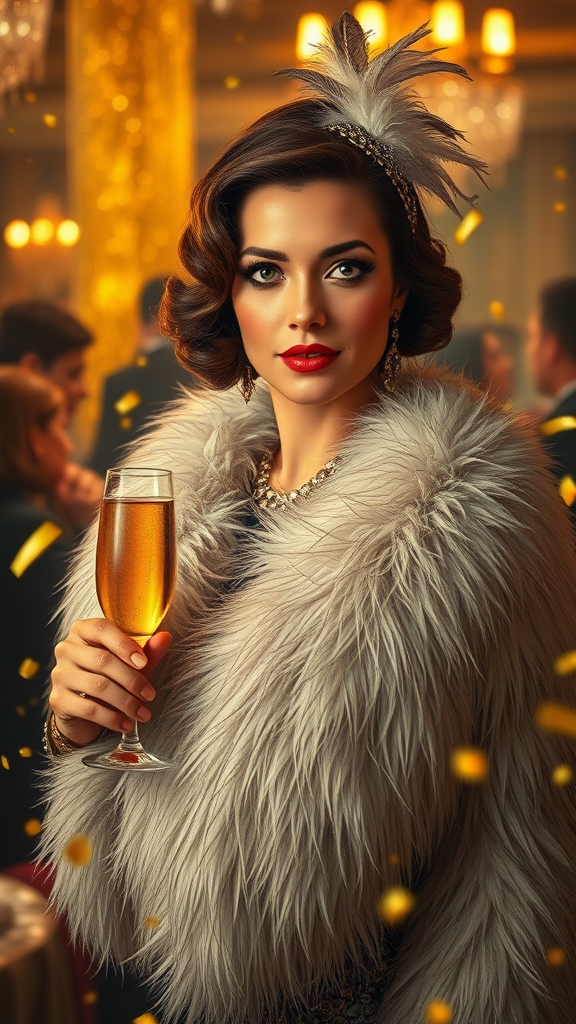 Wide shot character portrait of an elegant socialite at a glamorous 1920s Gatsby-themed party, featuring a strikingly beautiful woman draped in an art nouveau ermine stole, exuding sophistication. She is adorned with a feathered headpiece, holding a glass of champagne amidst a cascade of gold confetti. The scene is rendered in a highly detailed, cinematic composition, capturing the essence of a painterly concept reminiscent of an ArtStation masterpiece. The digital speed painting showcases intricate details and a vibrant atmosphere, presented in a widescreen format and trending on art platforms, with subtle creative variations adding a unique flair.