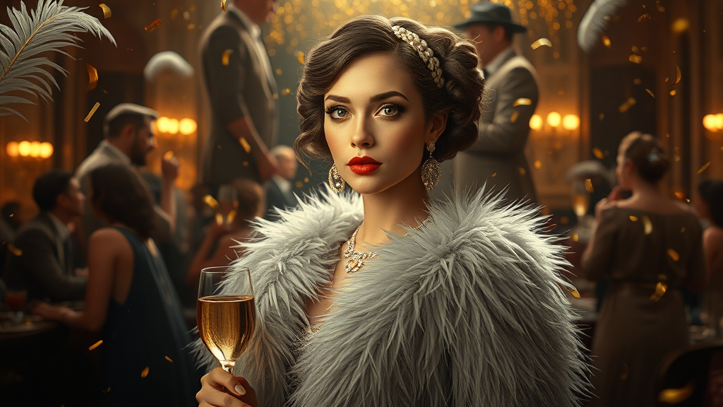 Wide shot character portrait of an elegant socialite, a beautiful woman in a 1920s Gatsby party setting, adorned in art nouveau attire with an ermine stole, exuding class and sophistication amidst feathers, champagne, and golden confetti; the scene is captured in a highly detailed, cinematic composition reminiscent of concept paintings found on ArtStation, featuring digital speed painting techniques and a widescreen format, maintaining a sense of grandeur and trending artistry while avoiding close-ups.