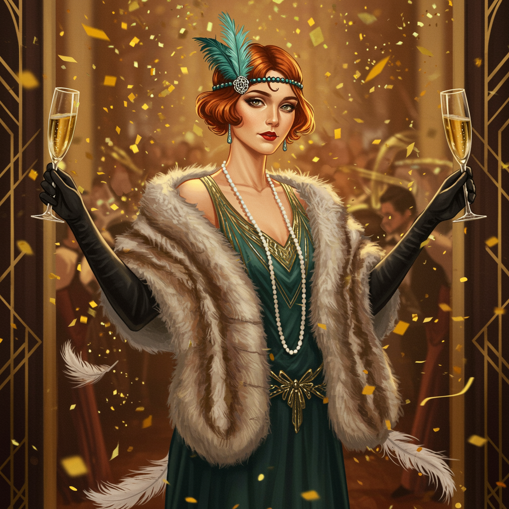 Wide shot character portrait of an elegant socialite, stunning woman in 1920s Gatsby-inspired attire, adorned with an art nouveau ermine stole, exuding sophistication, surrounded by delicate feathers, champagne flutes, and a shower of gold confetti, intricately detailed, cinematic style composition, concept painting with an ArtStation painterly feel, high detail, digital speed painting, widescreen, art trending on ArtStation, incorporating a subtle hint of jazz bands and vibrant party scenes in the background.
