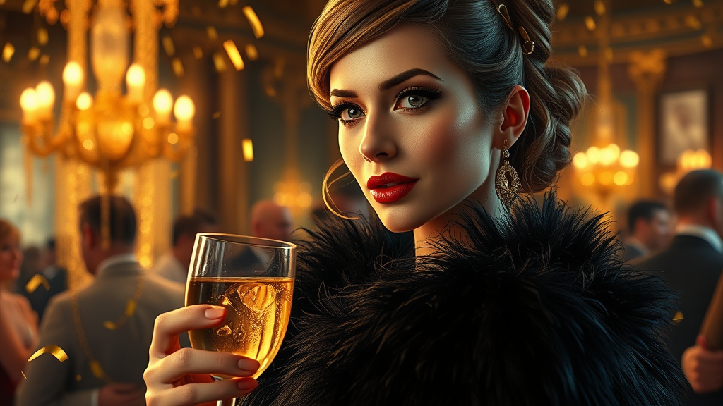Wide shot character portrait, stunning socialite, elegant woman, roaring 1920s Gatsby soirée, vintage Art Deco fashion, luxurious ermine stole, sophisticated, adorned with feathers, shimmering champagne, cascading gold confetti, highly detailed, cinematic composition, concept artwork, ArtStation painterly style, intricate detail, digital speed painting, widescreen perspective, popular on artstation.