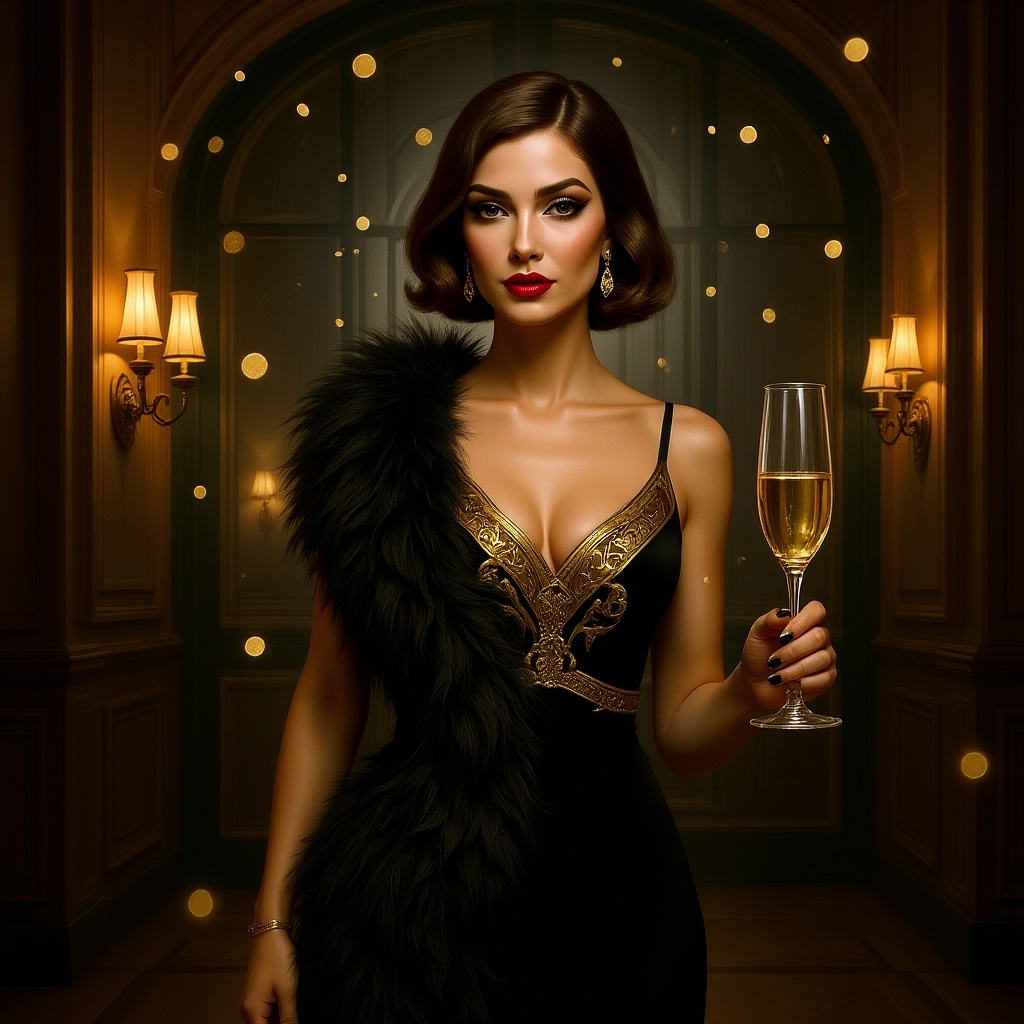 View this AI-generated image featuring wide shot character portrait elegant socialite beautiful woman roaring twenties gatsby soir e art nouveau ermine stole sophisticated adorned with feathers champagne in hand showered in gold confetti intricately detailed cinematic composition concept painting ar
