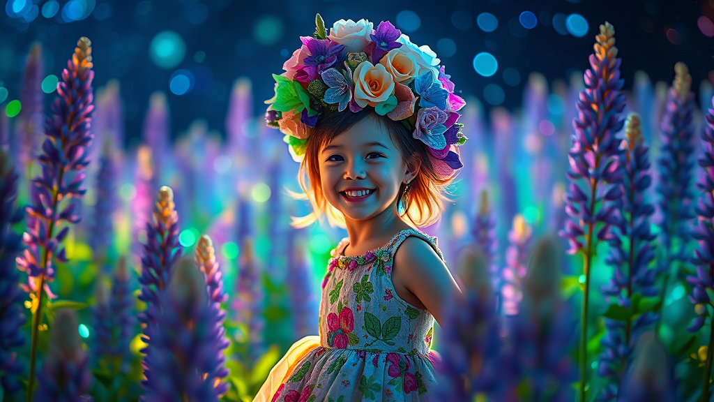Wide-shot full body portrait of a joyful, giggling kawaii flower fairy girl, a 5-year-old delightfully dancing through a field of towering lupines, infused with lucid weirdcore and cybercore elements, evoking a whimsical and dream-like aura as she gazes into the distance. Styled in an intricately detailed and marginalia-rich floral headdress, exuding vibrant colors with shades of blue, green, and purple, emitting a gentle glow. The background unfolds into a vivid, glowing floral wonderland, speckled with ethereal particles in blue, green, and purple hues. This composition adheres to the rule of thirds and the golden ratio, showcasing photorealism with raytraced shadows and a profound depth of field. The asymmetric arrangement invites a hypermaximalist appreciation, bursting with insane details rendered through octane and unreal engine in cinematic 8k realism.