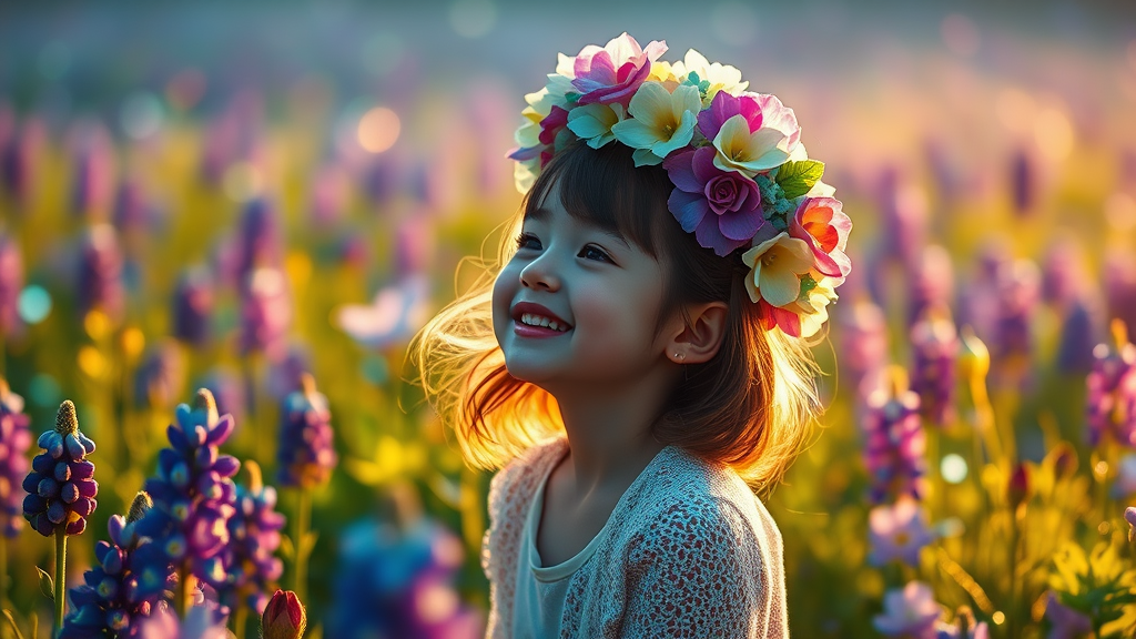 Wide-shot full body portrait of a joyful laughing kawaii flower fairy girl, a 5-year-old delightfully playing in a field of vibrant lupines, embodying a sense of wonder. Lucid dream-like weirdcore and cybercore aesthetics are infused as she gazes off into the distance, enveloped in an aura of whimsy. The scene is styled with an insanely detailed intricate floral headdress, exuding beauty with an explosion of colors in blue, green, and purple hues, glowing with ethereal energy. The background reveals a glowing, vivid wonderland teeming with dreamlike particles in harmonious shades of blue, green, and purple, creating a surreal atmosphere. Crafted with an eye for rule of thirds and golden ratio, the composition boasts photorealism with raytraced shadows and depth of field for an immersive experience. An asymmetric yet harmonious composition introduces hypermaximalist elements with insane details achieved through octane rendering, balancing cinematic realism. Shot using an unreal engine, the visual immersion is enhanced at 8k resolution, revealing a scene both fantastical and tangibly real, inviting viewers into an enchanting realm where the boundaries between reality and dreams blur.