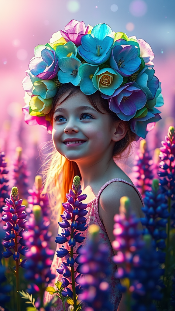 Wide-shot full body portrait of an exuberant kawaii flower fairy girl, a joyful 5-year-old with a radiant smile, reveling amidst a sea of vibrant lupines. The scene embodies a lucid weirdcore and cybercore dream-like quality, as she gazes into the distance with an expression of wonder. Her intricate floral headdress is styled with extravagant detail, featuring a kaleidoscope of blue, green, and purple colors that emit a gentle glow. The background is a vivid floral wonderland, alive with shimmering particles in shades of blue, green, and purple, creating an ethereal atmosphere. The composition uses the rule of thirds and the golden ratio to enhance the photorealism, with carefully raytraced shadows and a captivating depth of field. It features an asymmetric design and hypermaximalist detailing, rendered in stunning 8k quality using octane render for cinematic realism, akin to the capabilities of an unreal engine.
