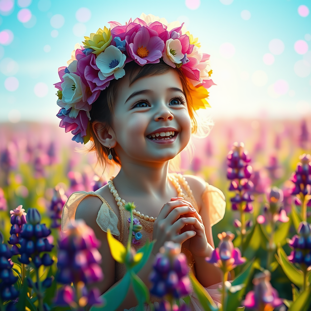 Wide-shot full body portrait of an exuberant laughing kawaii flower fairy girl, a 5-year-old marvel playing joyously amidst a vibrant lupine field, her gaze thoughtfully cast into the distance, evoking a surreal weirdcore cybercore dream essence. The scene is styled with hyper-detailed intricate marginalia and a resplendent floral headdress in explosive blues, greens, and purples, emitting a radiant glow. The background transforms into a luminous, dreamlike floral wonderland alive with vibrant particles dancing in blue, green, and purple hues. The composition employs the rule of thirds and the golden ratio, achieving photorealism with raytraced shadows and depth of field, set with an asymmetric yet harmonious layout. This hypermaximalist portrayal teems with insane details rendered in octane, blending with the realism of cinema through unreal engine technology in stunning 8k resolution.