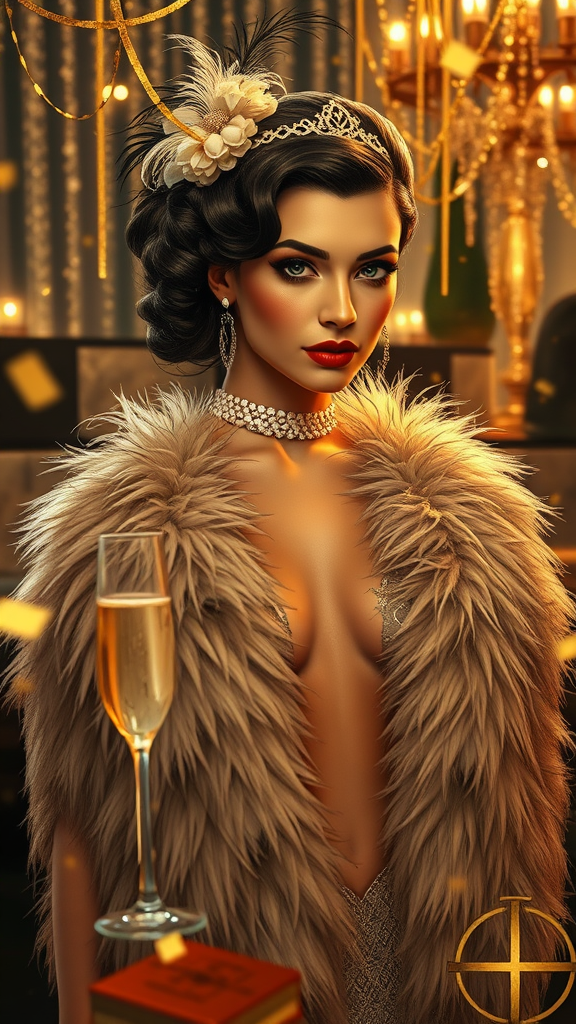 Wide shot of a stunning socialite, elegant and captivating, a beautiful woman adorned in 1920s Gatsby style attire at an opulent party, draped in an art nouveau ermine stoll, exuding class, with luxurious feathers in her ensemble, surrounded by the gleam of champagne and cascading gold confetti, intricately detailed, cinematic feel, concept painting with a painterly touch, inspired by ArtStation aesthetic, high detail, dynamic digital speed painting, widescreen format, capturing the essence of a lively, glamorous era.