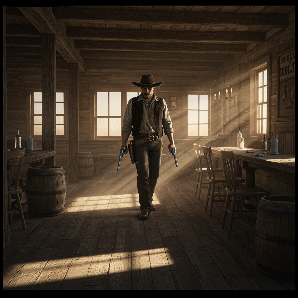 Wild West sharpshooter, lone cowboy, rustic saloon setting, 1880s era, detailed hand depiction, vintage tintype feel, rugged charm, sunlit dust particles filtering through wooden planks, character's shadow casting long on the creaking floorboards, aura of mystery and legend, untamed frontier atmosphere, capturing the spirit of the Old West.