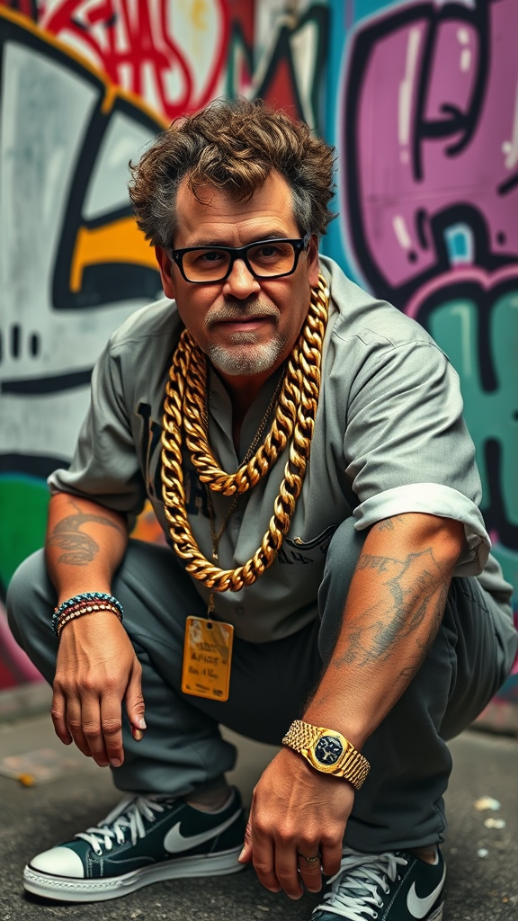 Will Ferrell embodying an urban gangsta rapper vibe, adorned with a chunky gold chain necklace, crouched in a classic gangsta pose reminiscent of Eazy-E. The background is adorned with vibrant, colorful graffiti, capturing the essence of urban street art in a photorealistic style, complete with a bold and confident expression. A subtle nod to 90s hip-hop culture enriches the overall atmosphere.