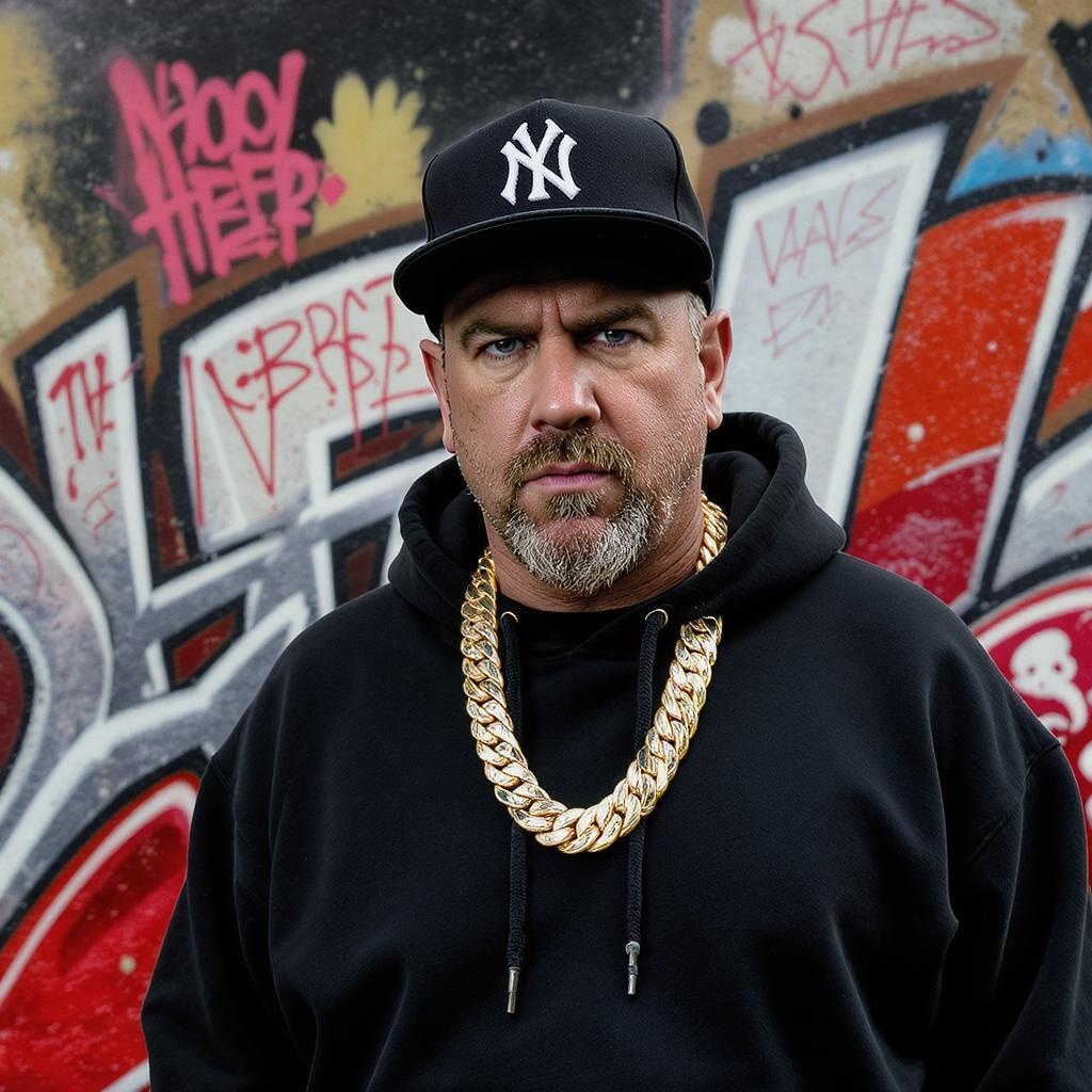 Will Ferrell embodying the essence of an urban gangster rapper, adorned with a chunky gold chain around his neck, striking a classic gangster pose reminiscent of Eazy-E. The backdrop features vibrant and intricate graffiti art, capturing the gritty yet colorful urban landscape. The image is rendered in photorealism, preserving the authenticity of the scene while bringing out the unique blend of Ferrell's comedic aura with a hardened street style.