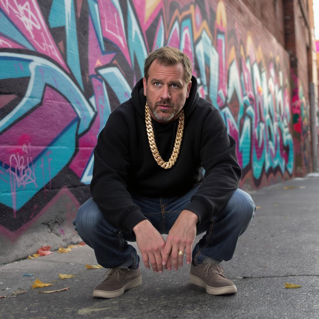 Will Ferrell striking a classic urban rapper pose, adorned with a large gold chain necklace, crouching confidently in the style reminiscent of Eazy-E. The backdrop features vibrant, colorful graffiti art with intricate designs, showcasing a dynamic urban street scene. The photorealistic depiction captures the contrast of his comedic persona with the edgy rapper aesthetic, highlighting a playful yet authentic homage to the hip-hop culture. Soft ambient lighting adds depth, reflecting off the gold of the necklace and the vibrant hues of the graffiti, enhancing the overall lifelike quality.