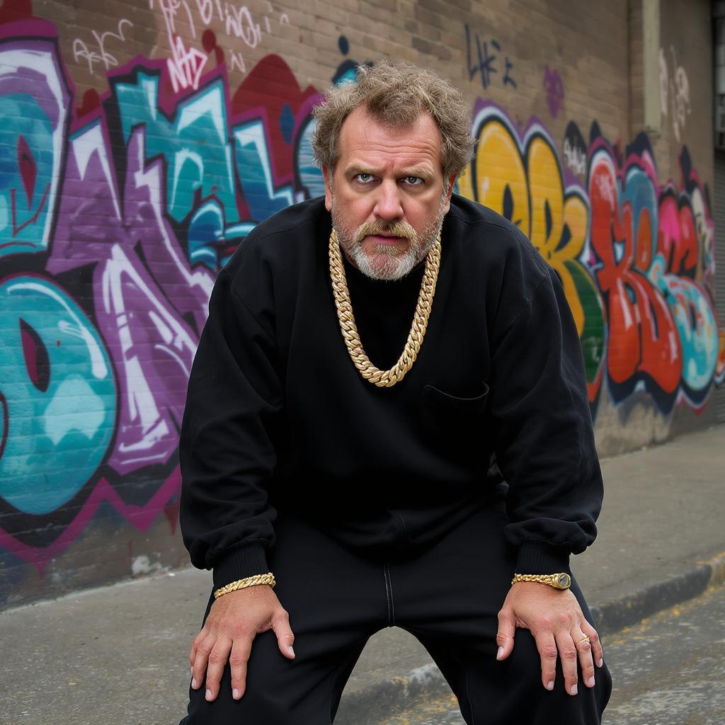 Will Ferrell transformed into an urban hip-hop artist, donning a prominent gold chain necklace. He adopts a low, confident crouch reminiscent of Eazy-E's iconic stance. Behind him, vibrant graffiti adorns the walls, adding a splash of color and city flair to the scene. The image captures a photorealistic essence, showcasing Ferrell's playful take on the gritty rapper persona against an authentic urban backdrop.