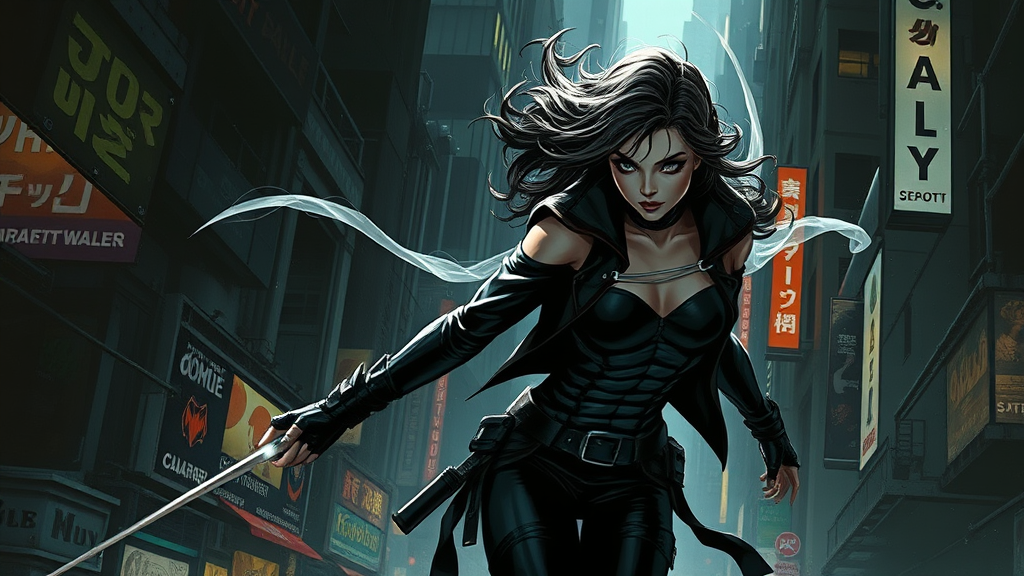 Will-o'-the-wisp, courageous young female superhero, imbued with Frank Miller's gritty style, traverses a shadowy metropolis, enveloped in moody and atmospheric lighting, captured in a dynamic action pose, hinting at her ethereal powers amidst the urban chaos --ar 4:5 --s 550.